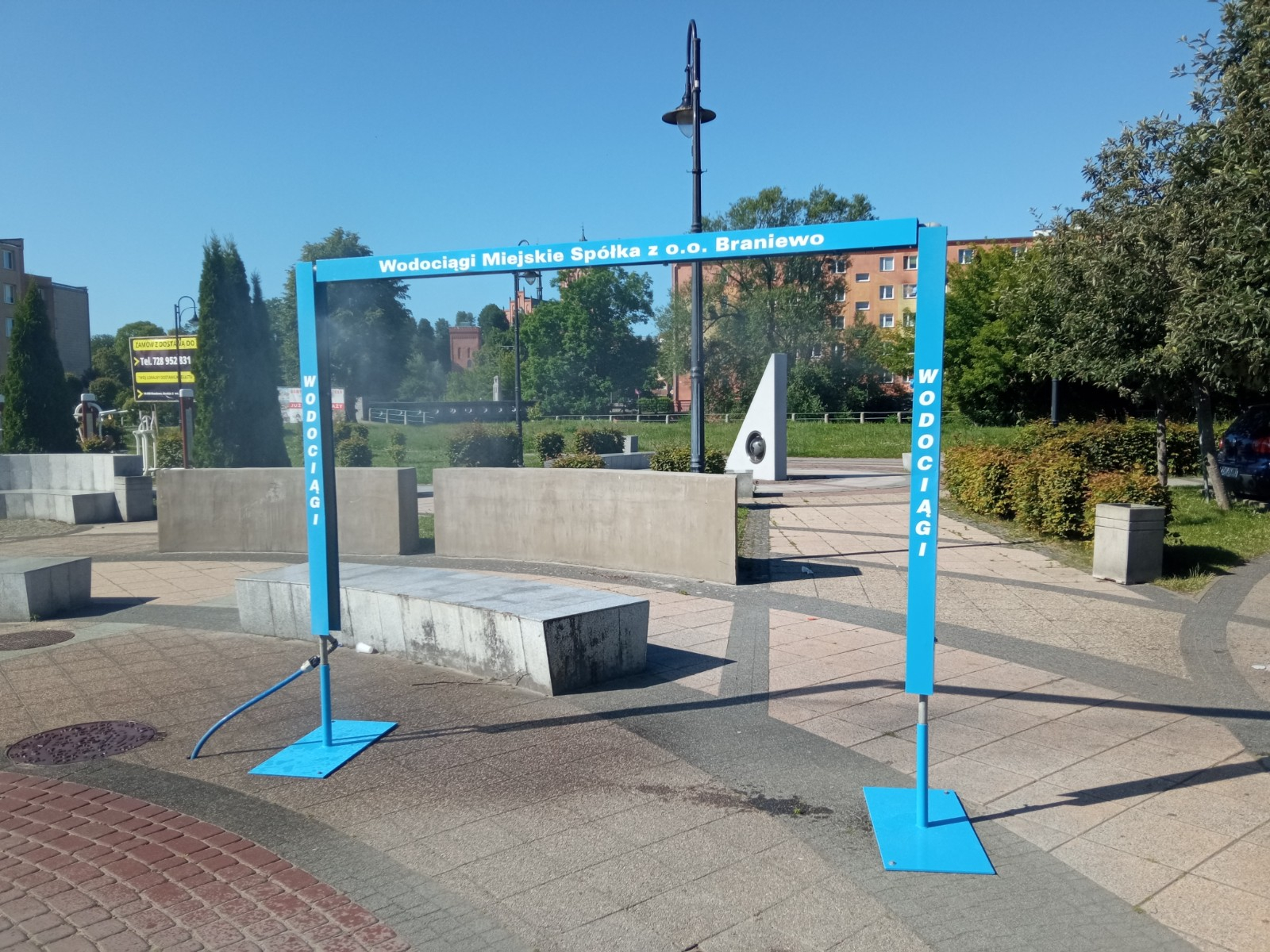 Zdjęcie przedstawia niebieską, metalową ramę w kształcie bramy, pełniącą funkcję kurtyny wodnej, z dysz tryska drobna mgiełka. Instalacja znajduje się na placu wyłożonym kostką brukową.